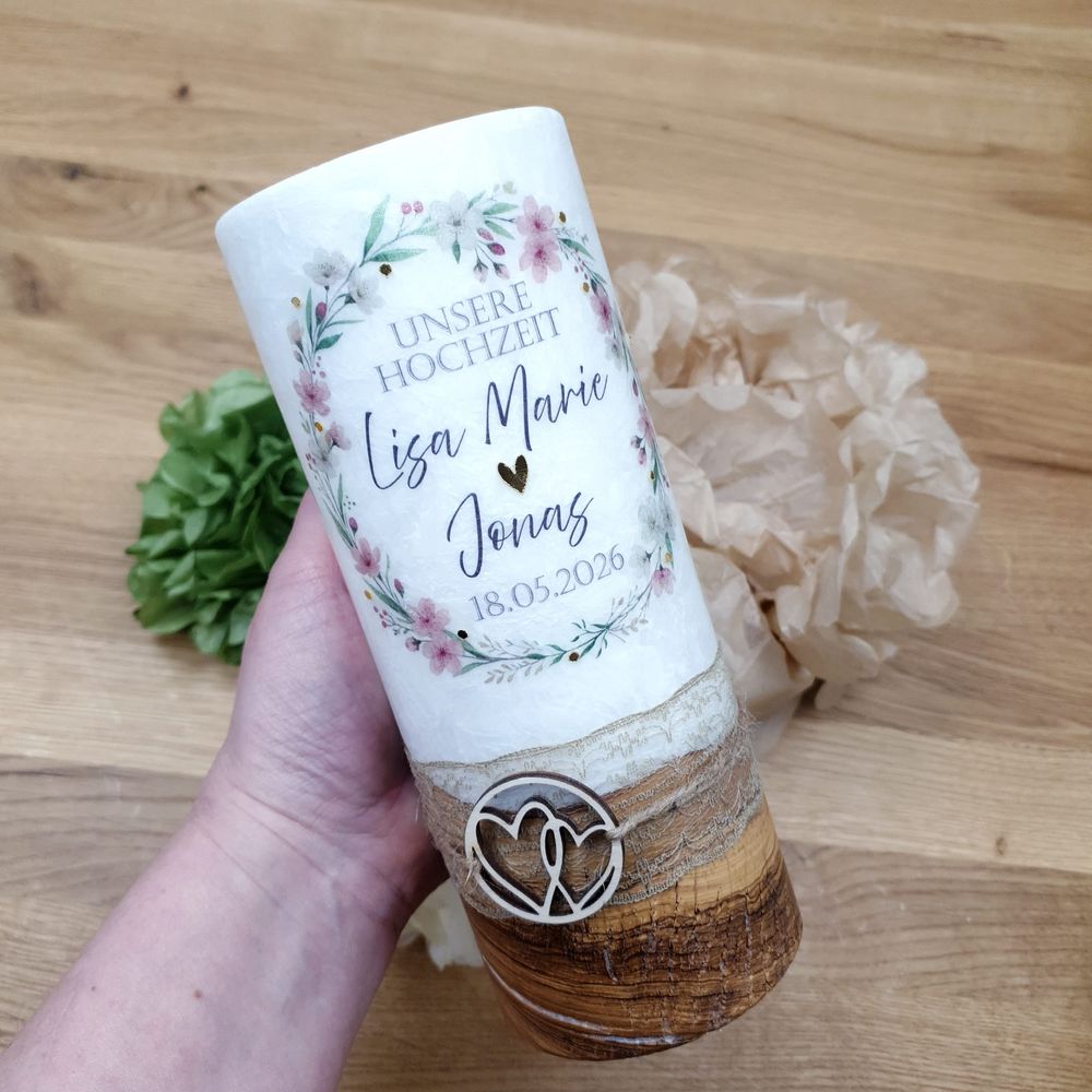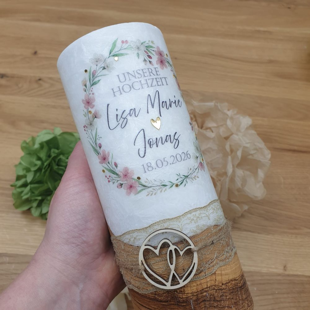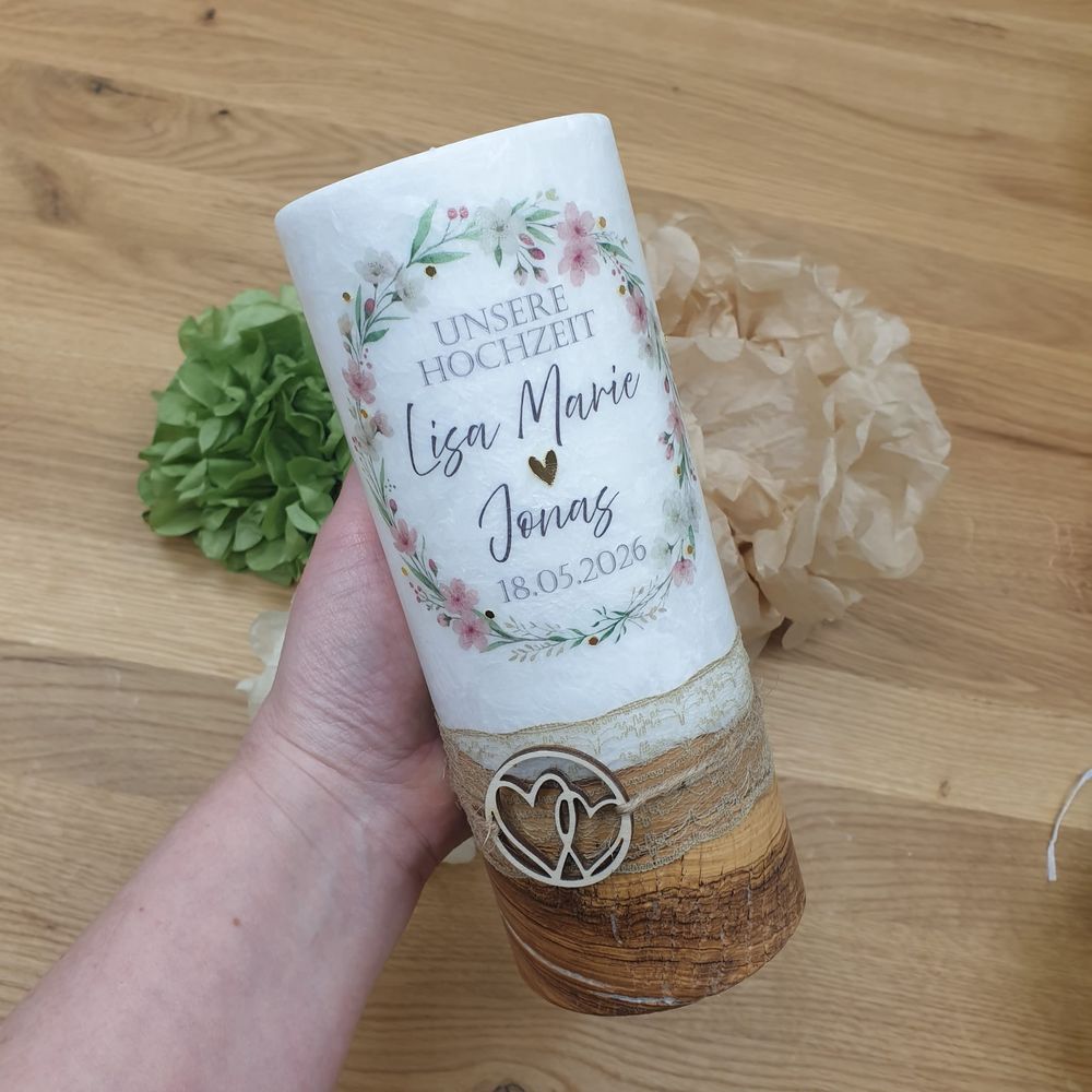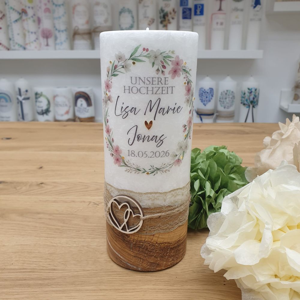 Hochzeitskerze mit Holz und Designdruck, Wachsverzierung und Holzanhänger aus unserer Kreativwerkstatt!