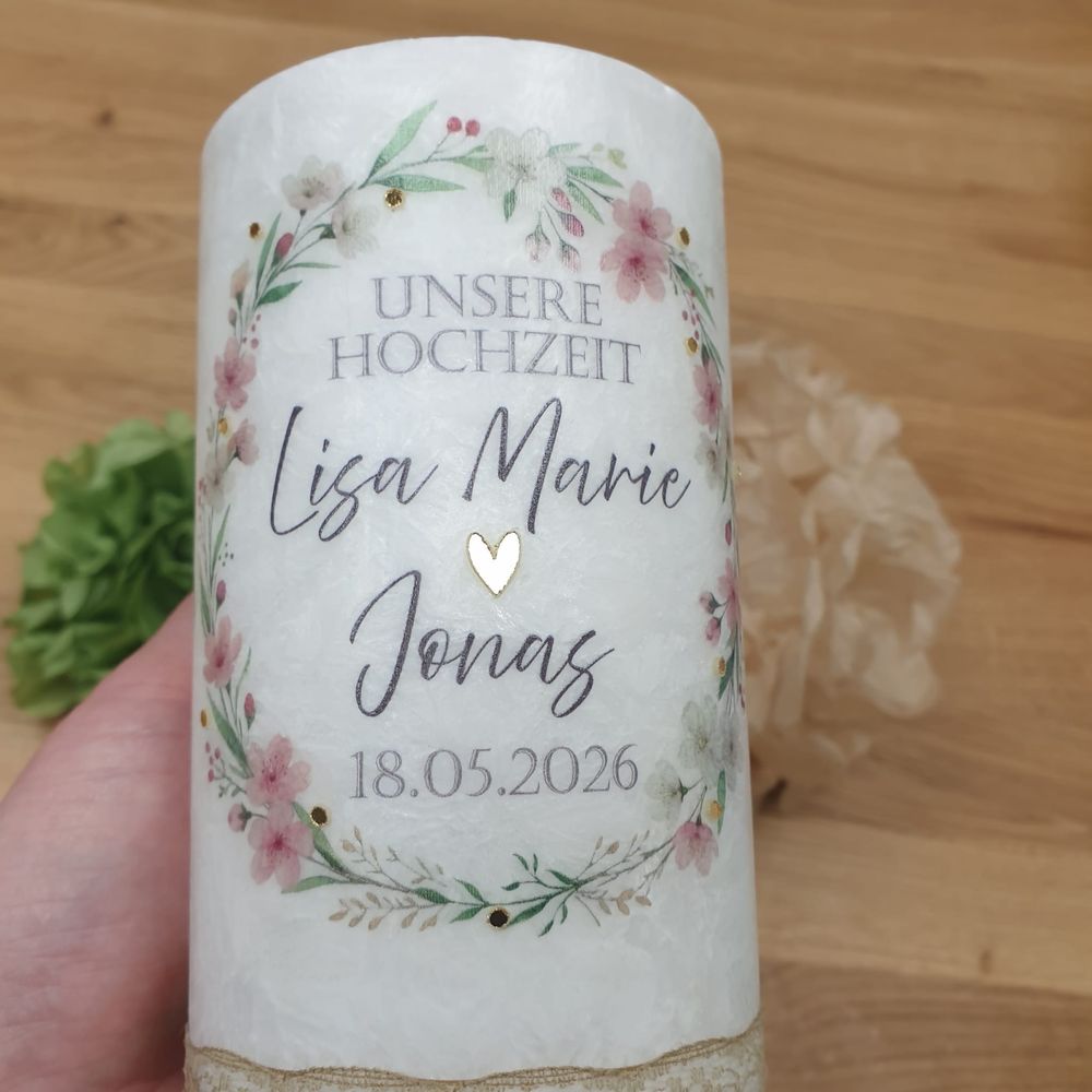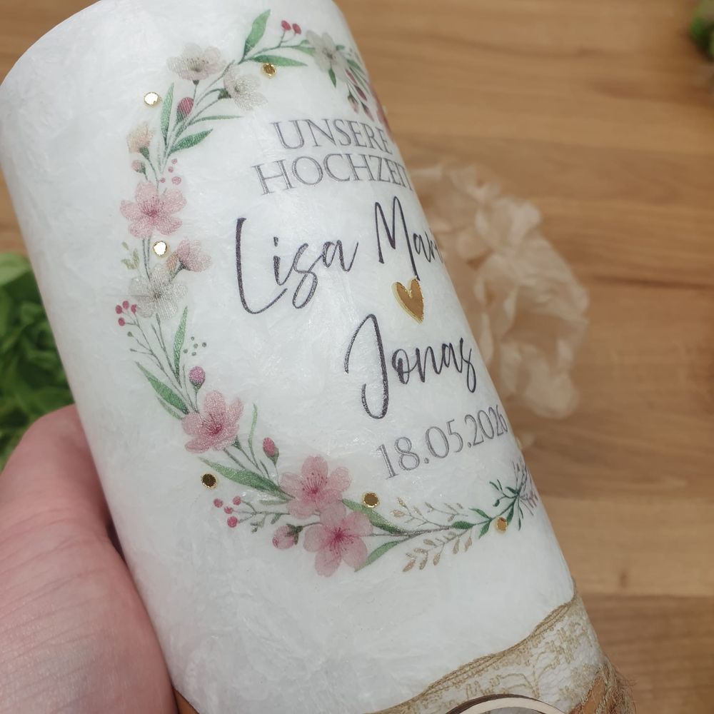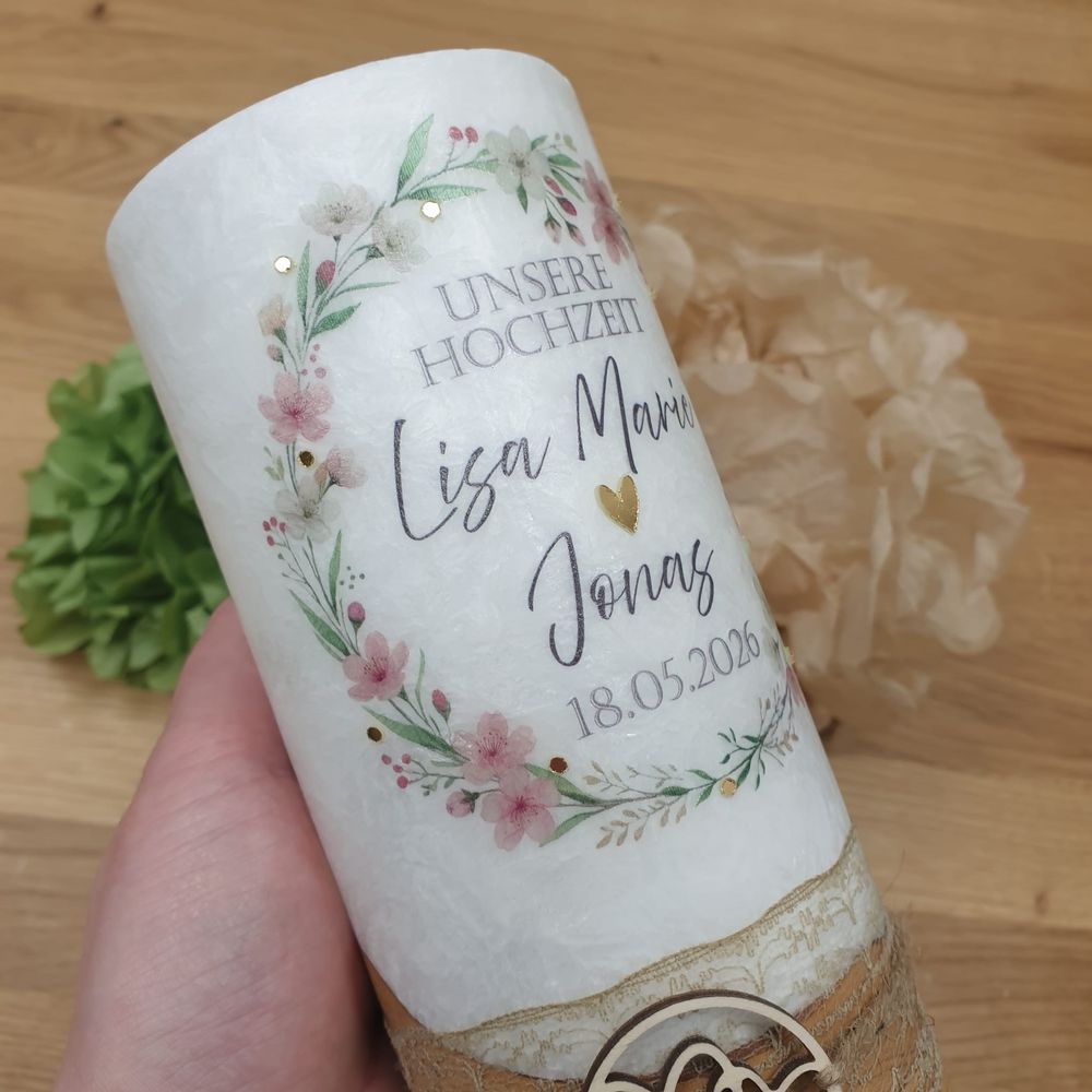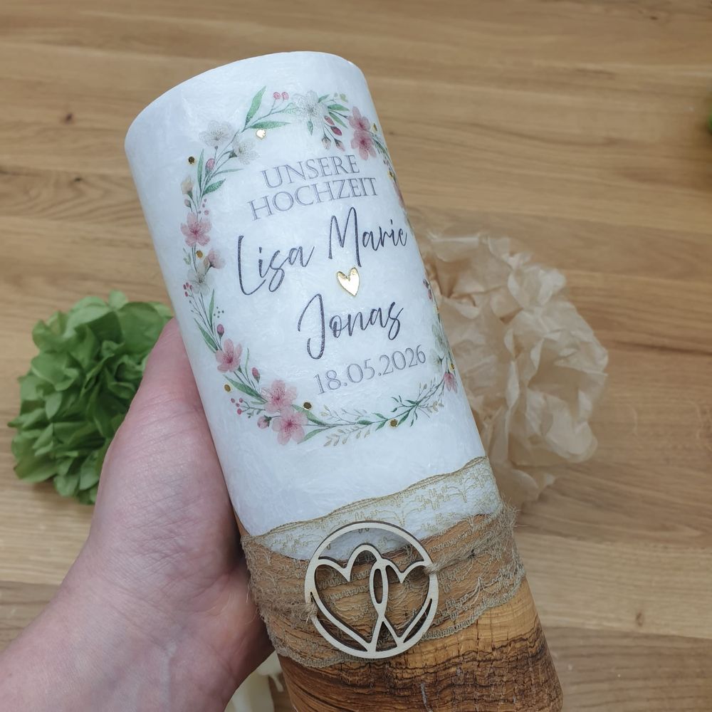 Hochzeitskerze mit Holz und Designdruck, Wachsverzierung und Holzanhänger aus unserer Kreativwerkstatt!