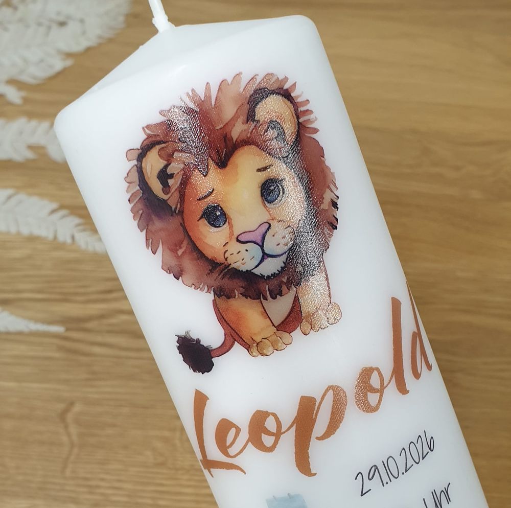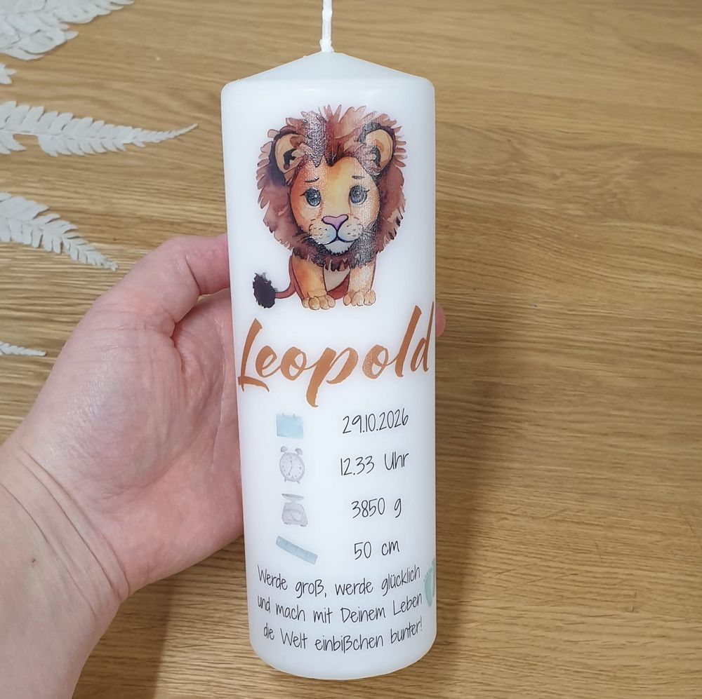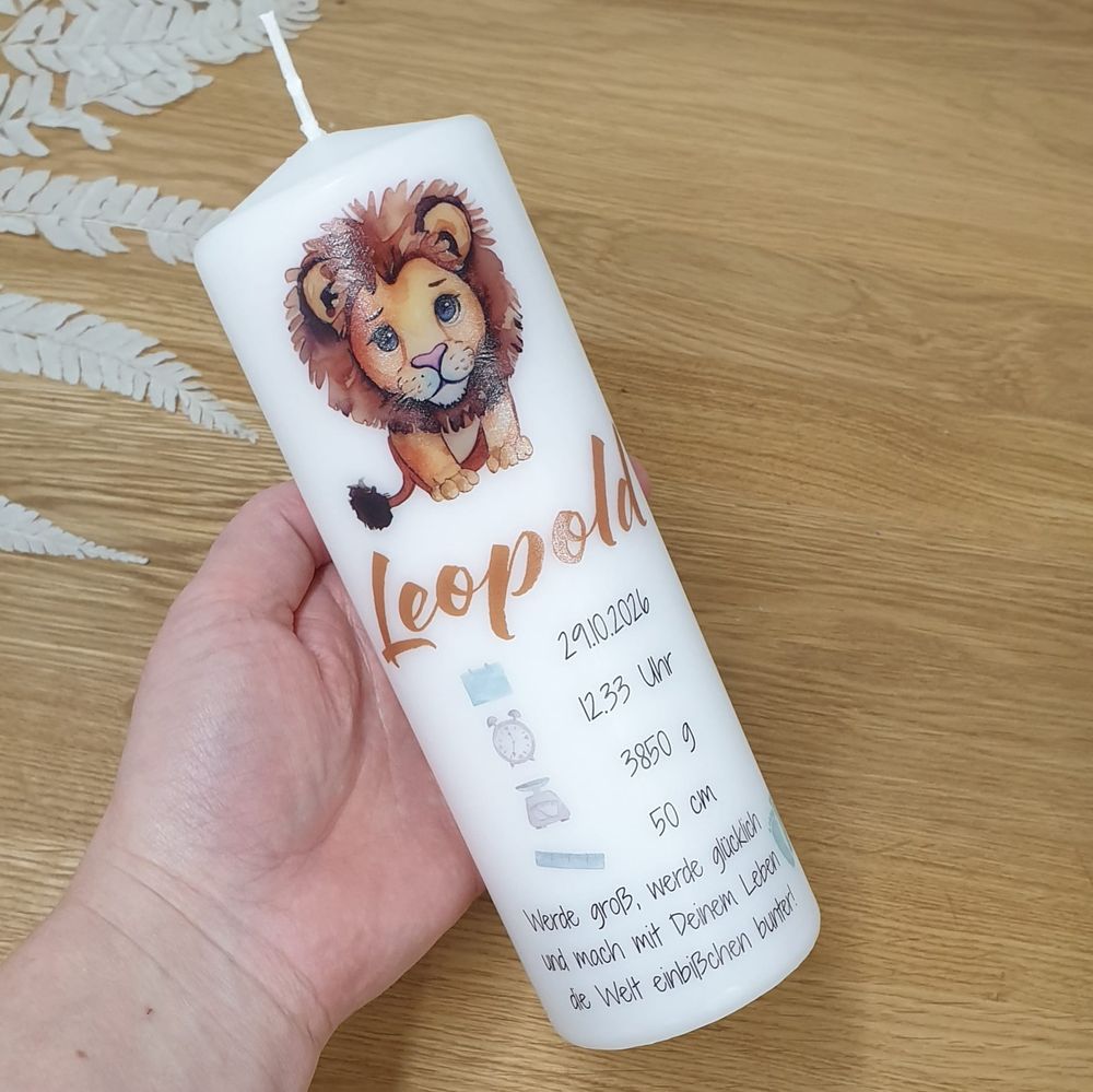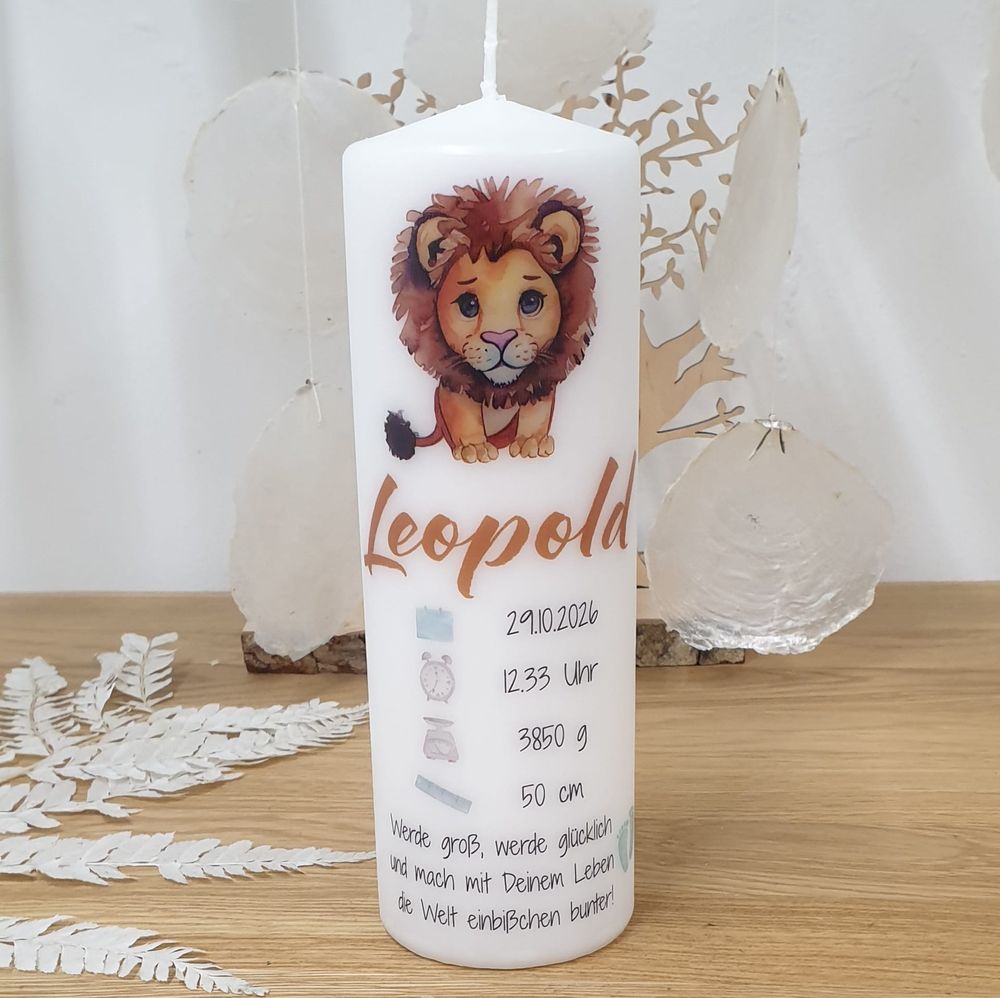 Wunderschöne Designdruck-Kerze zur Geburt mit Löwe, personalisiert mit Name, Geburtsdaten des Babys und Spruch.