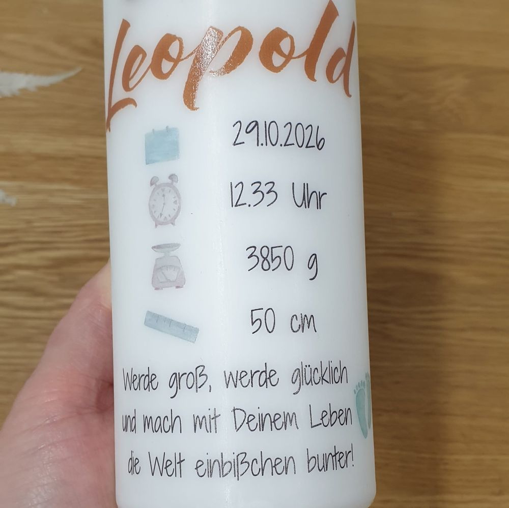 Natürlich wird Deine Kerze mit Deinem Wunschnamen und Wunschdaten und Spruch versehen.