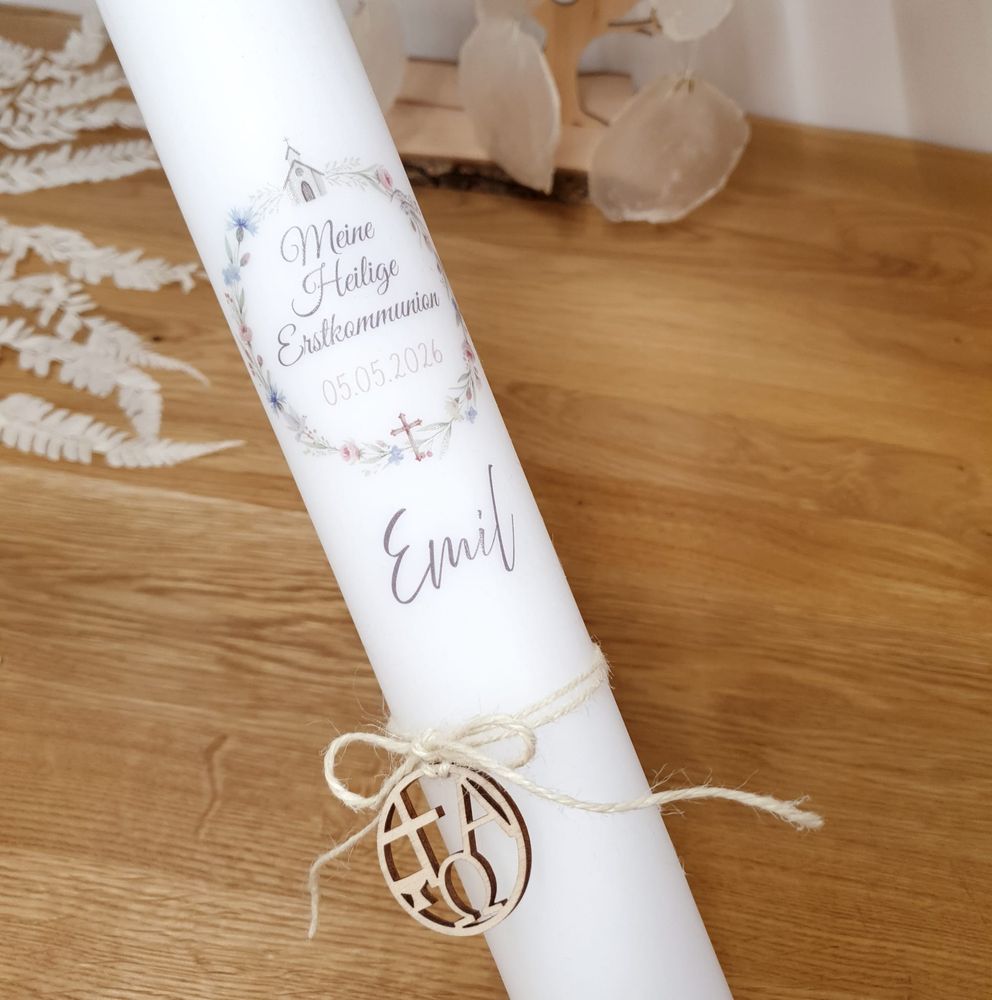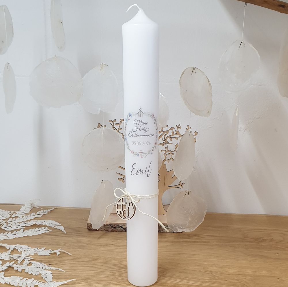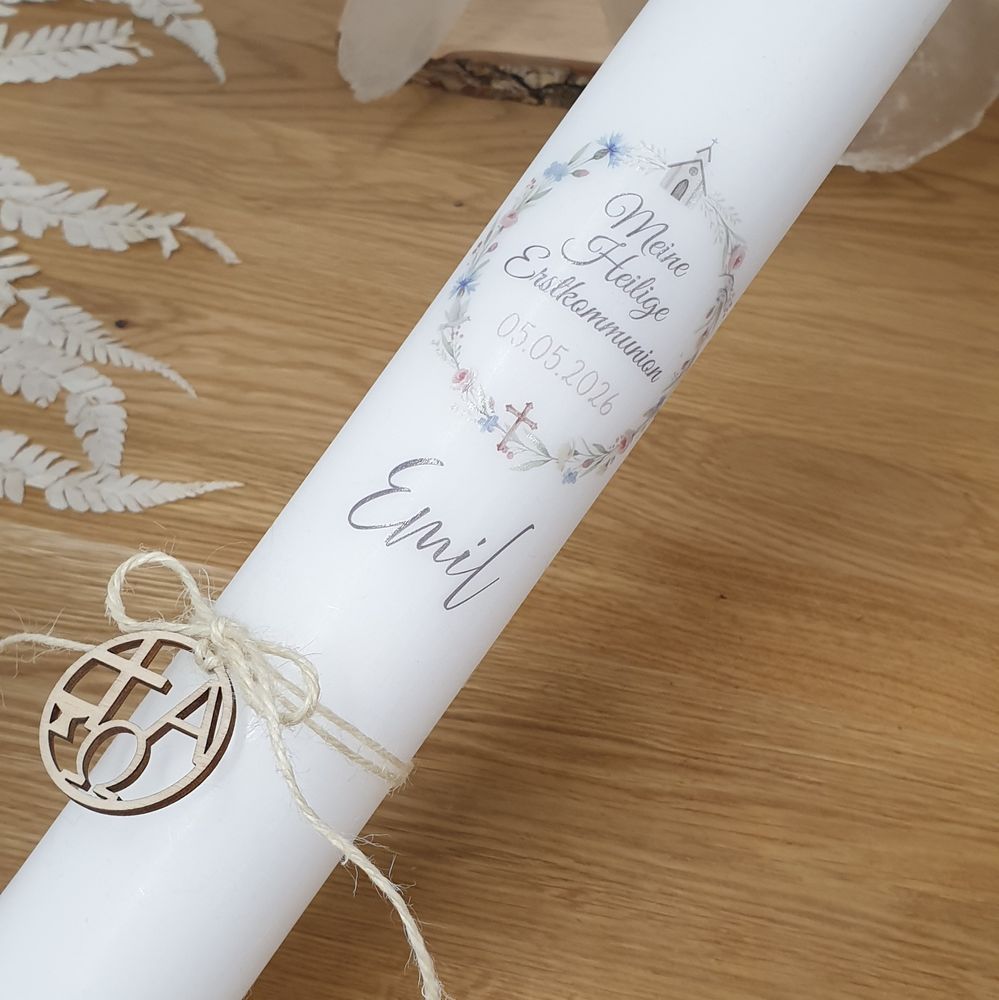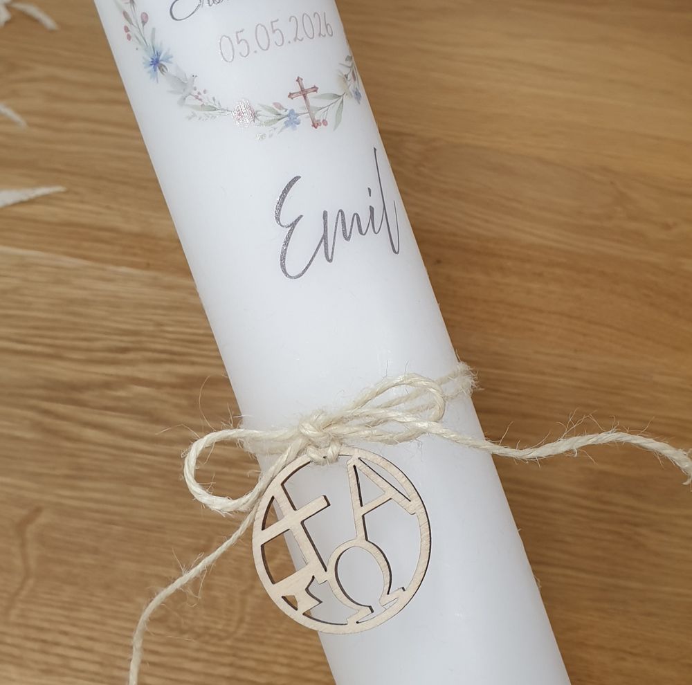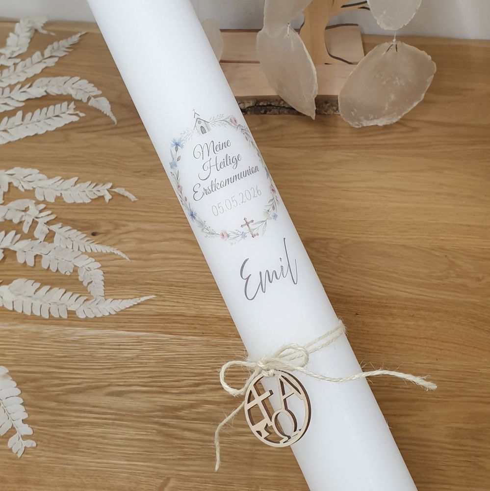 Kommunionkerze mit Designdruck EMIL mit Holzanhänger