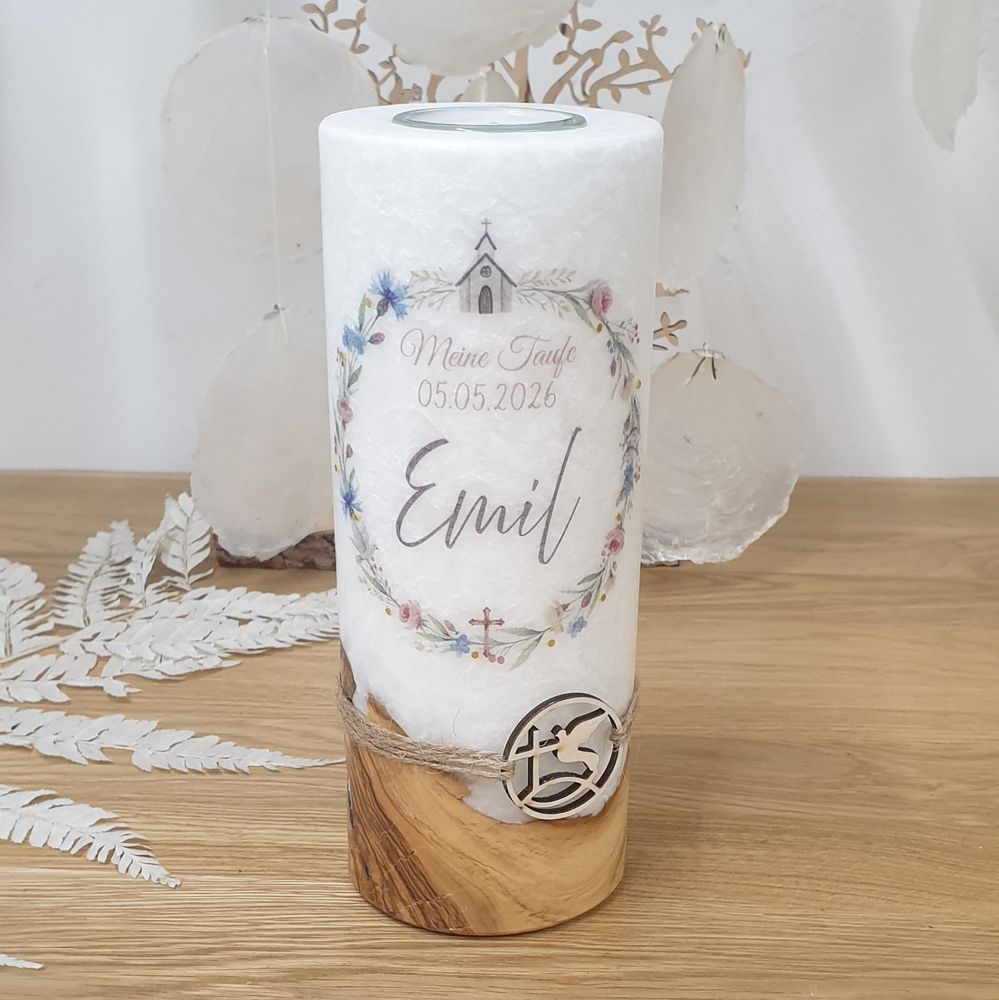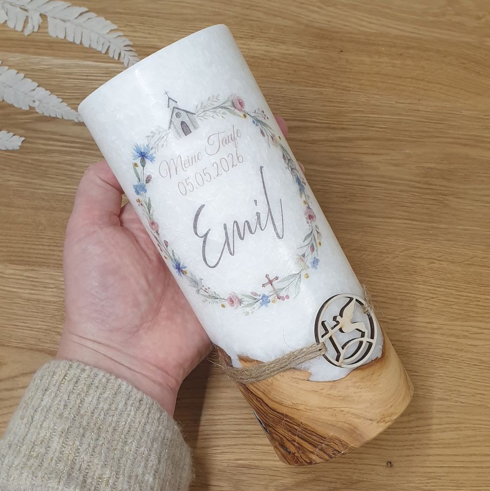 Taufkerze mit Designdruck und Wachsverzierung EMIL, mit echtem Holz und Holzanhänger