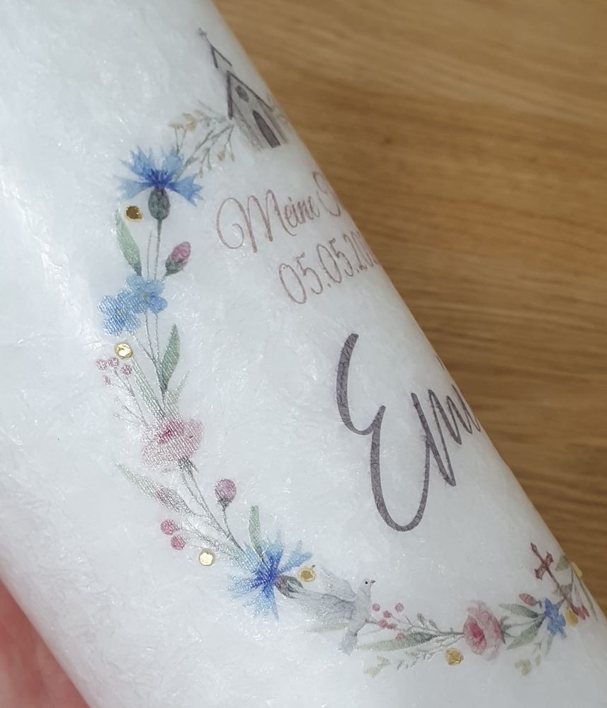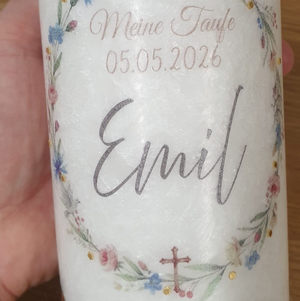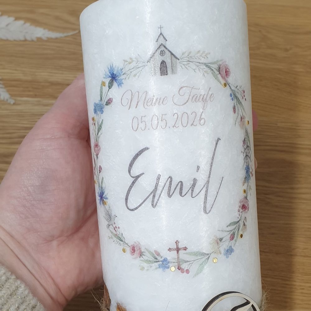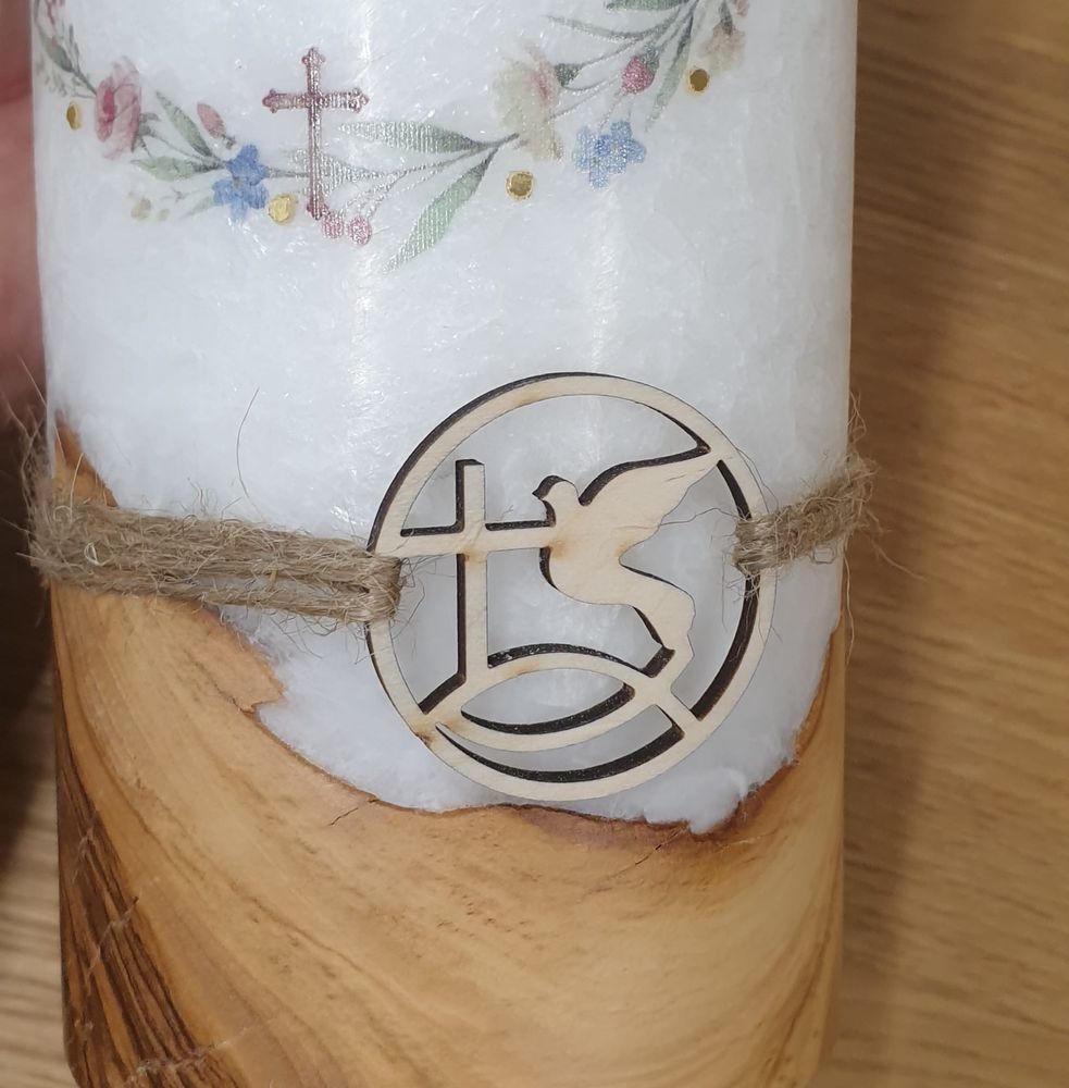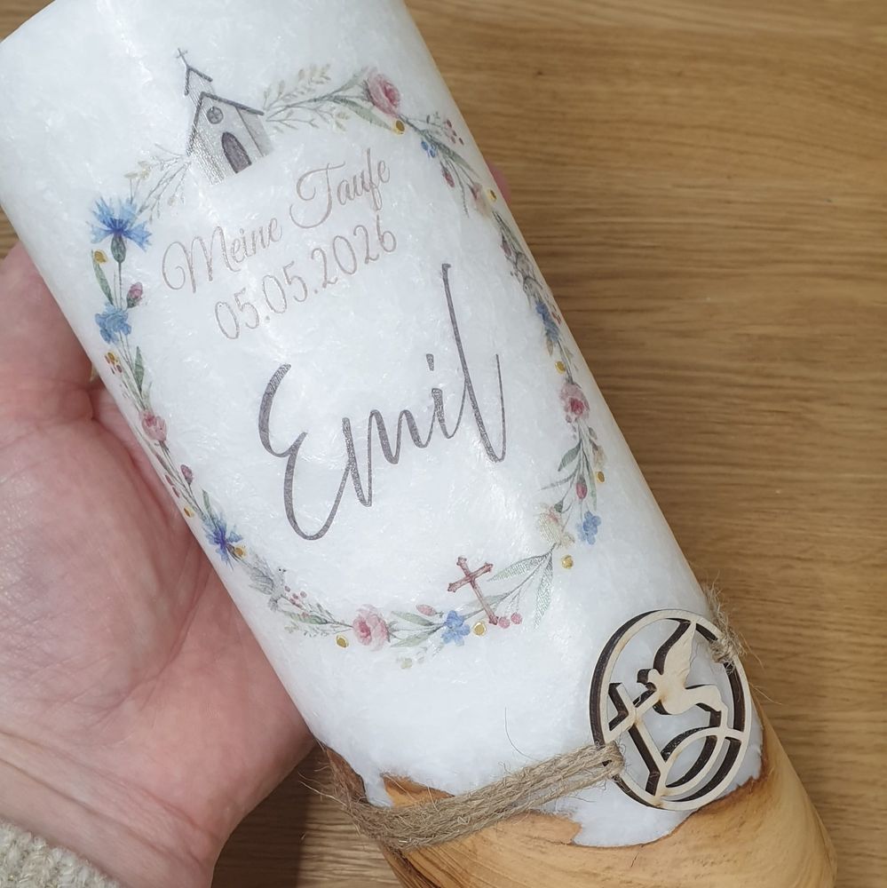 Taufkerze mit Holz und Designdruck, Wachsverzierung und Holzanhänger aus unserer Kreativwerkstatt!