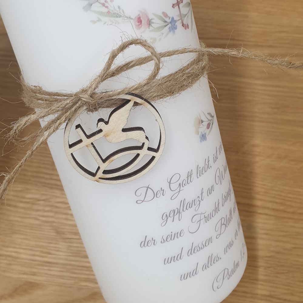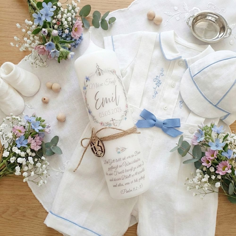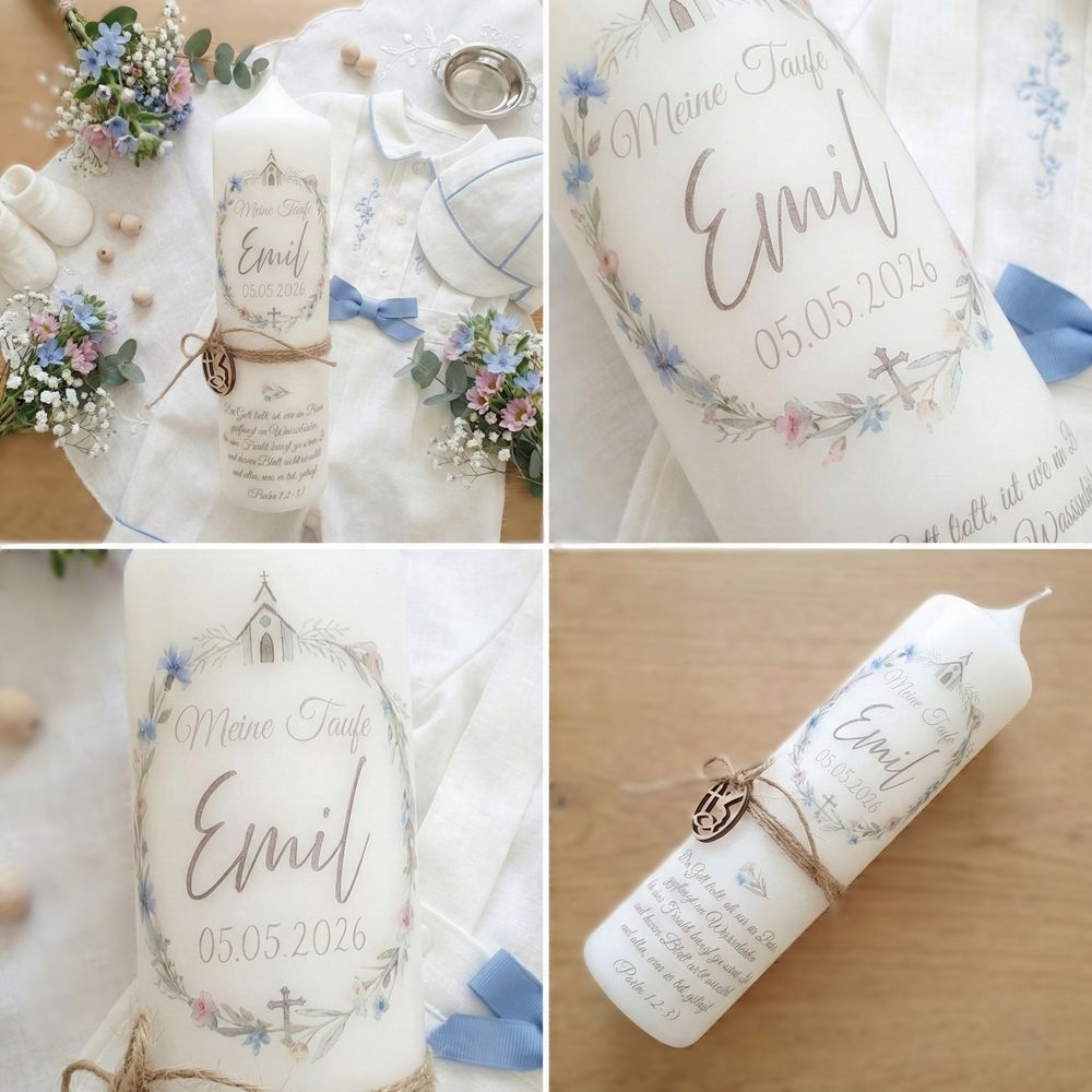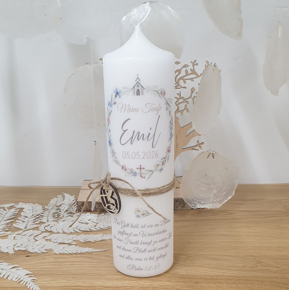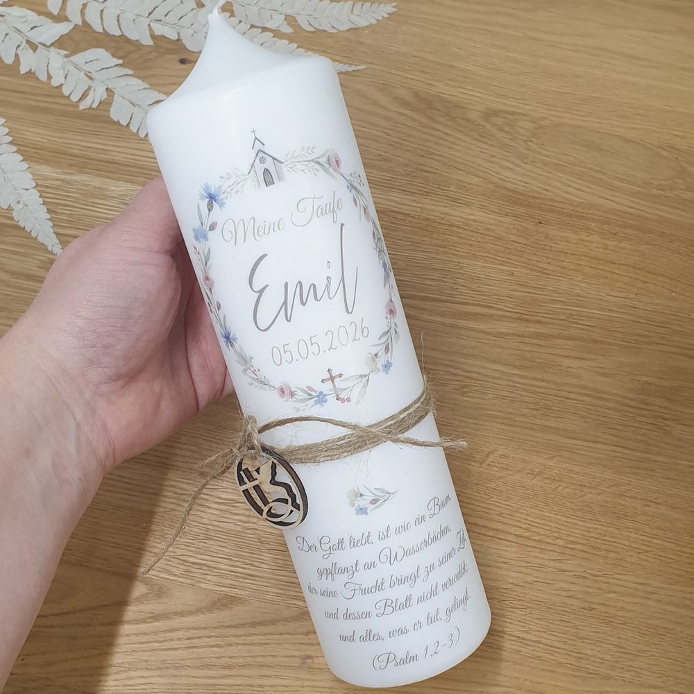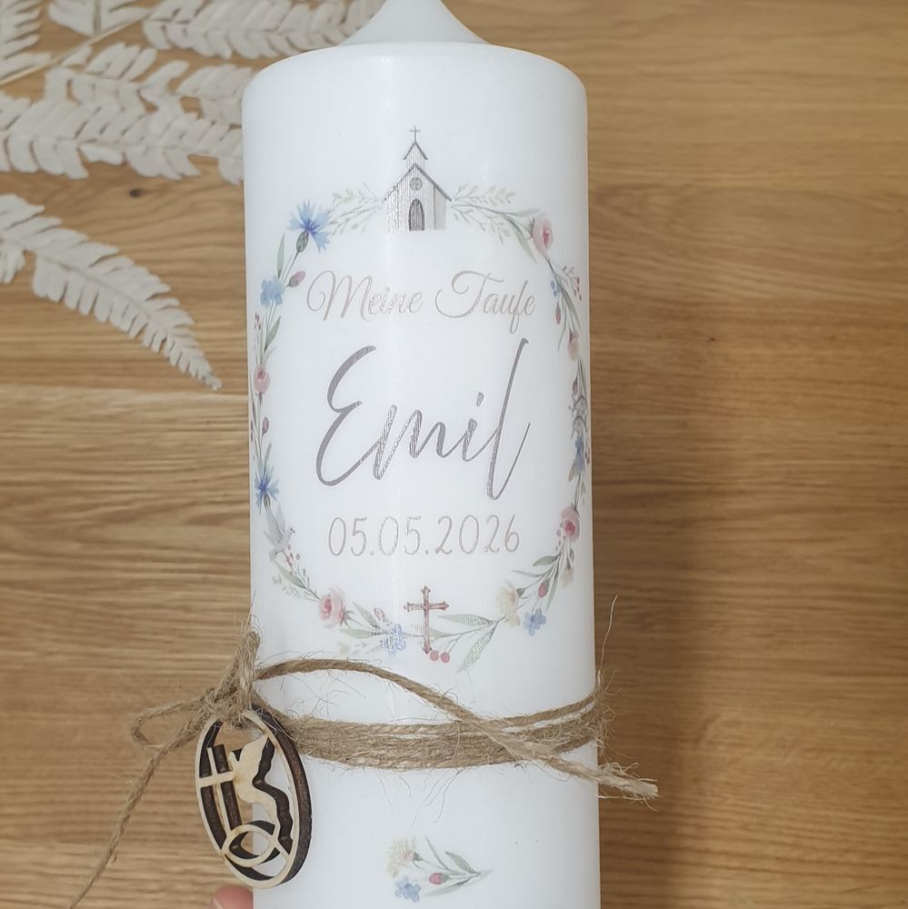 Taufkerze mit Designdruck EMIL, mit Holzanhänger, personalisiert für Jungen und Mädchen