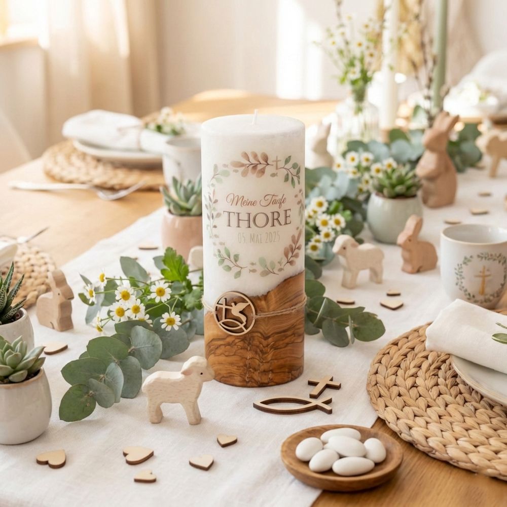 Taufkerze mit Designdruck THORE mit echtem Holz und Holzanhänger
