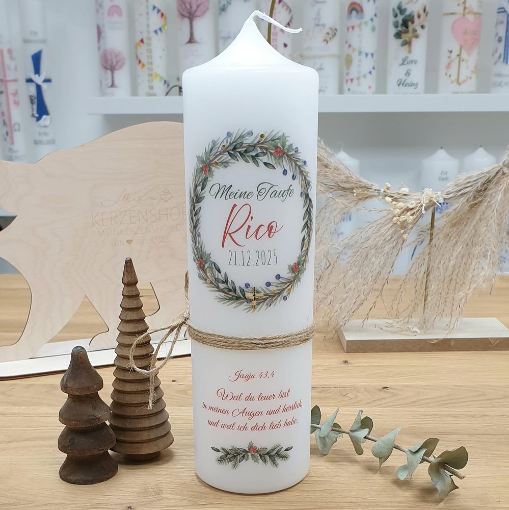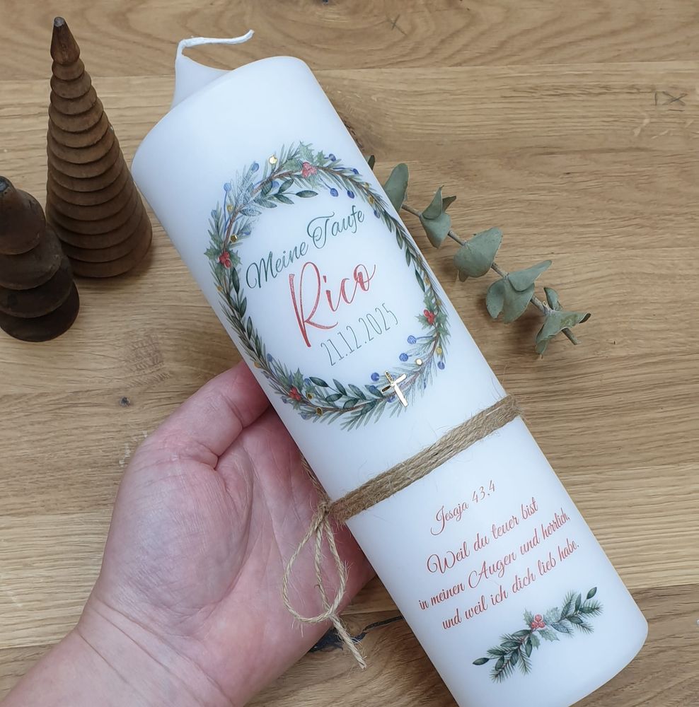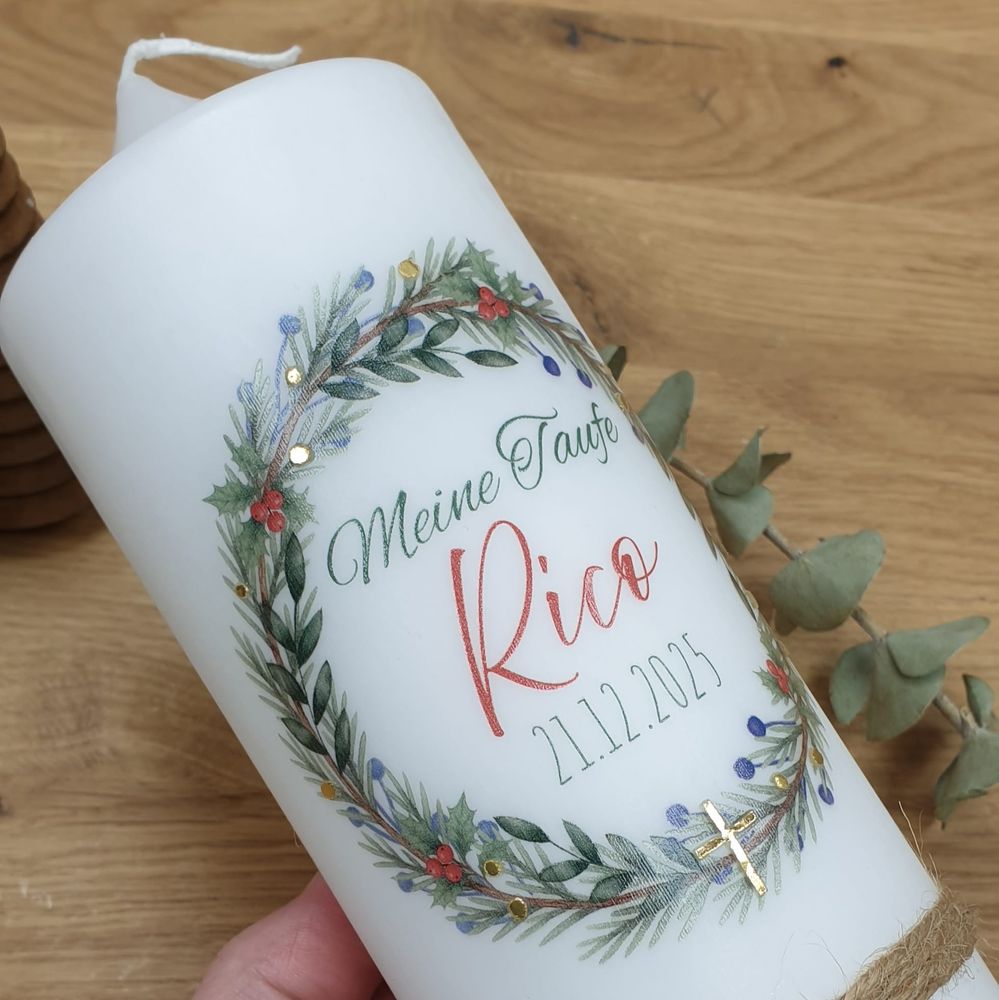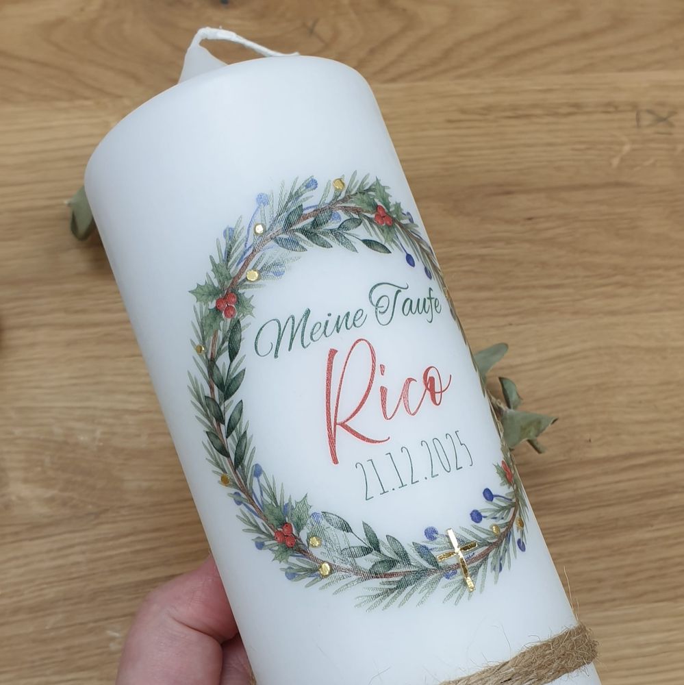 Taufkerze mit Designdruck und Wachsverzierung RICO, personalisiert für Jungen und Mädchen