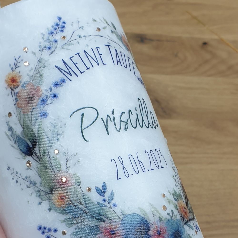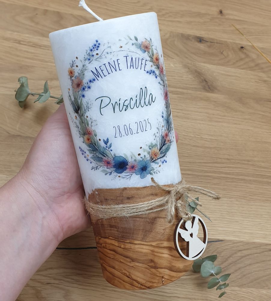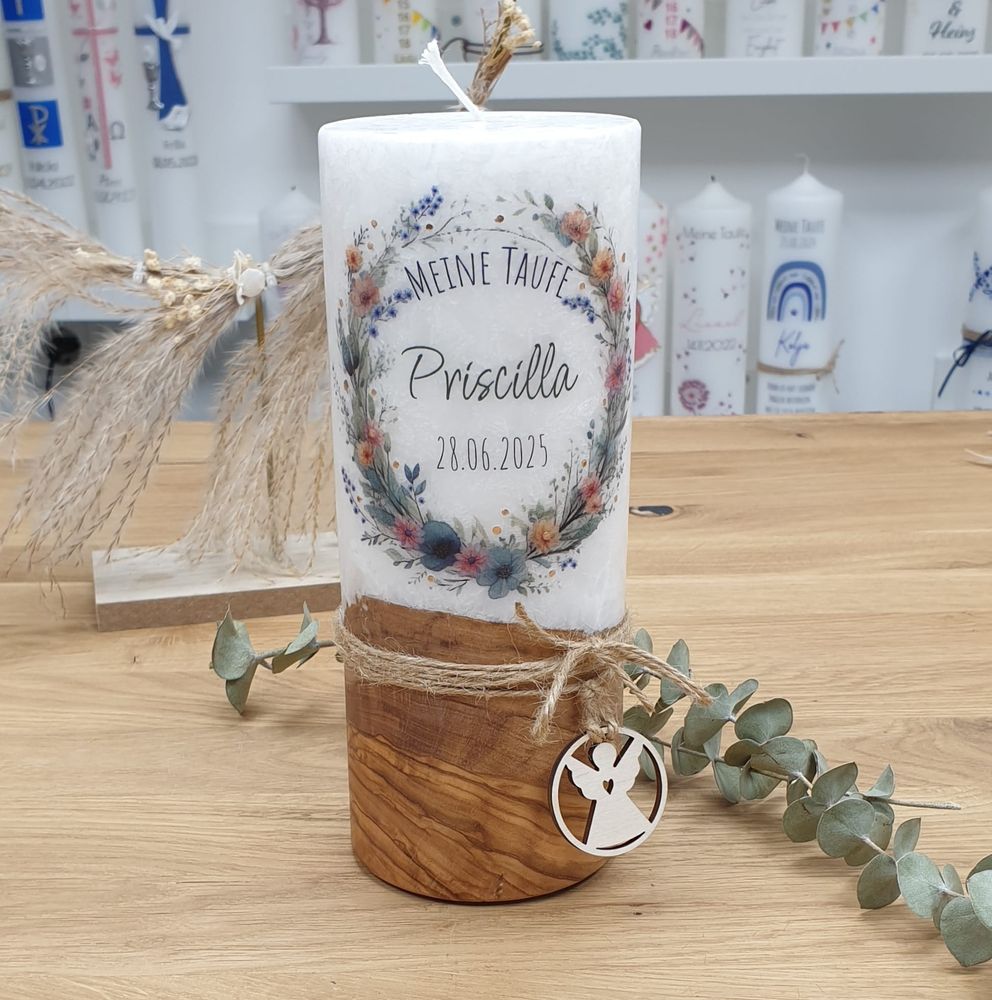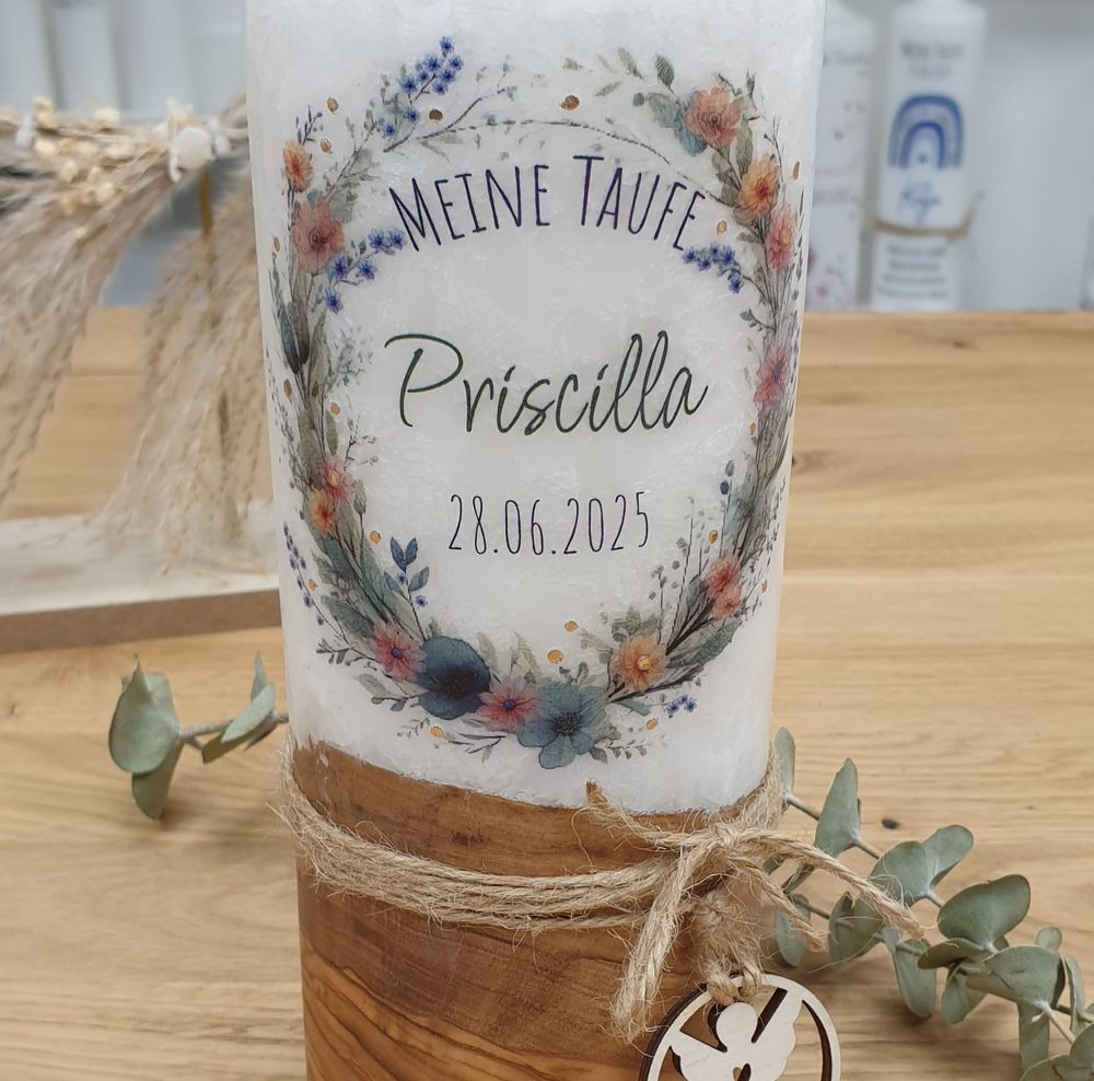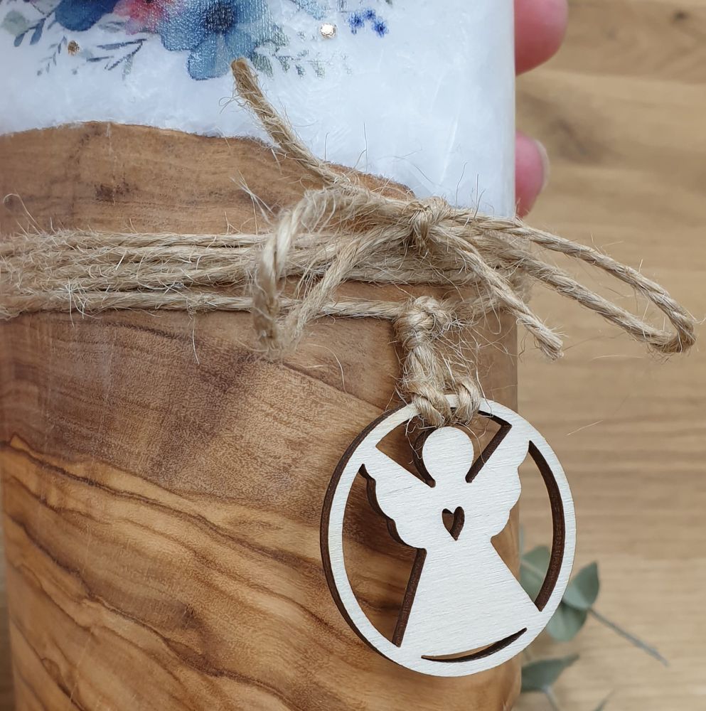 Taufkerze PRISCILLA mit Designdruck und Wachsverzierung, mit echtem Holz und Holzanhänger