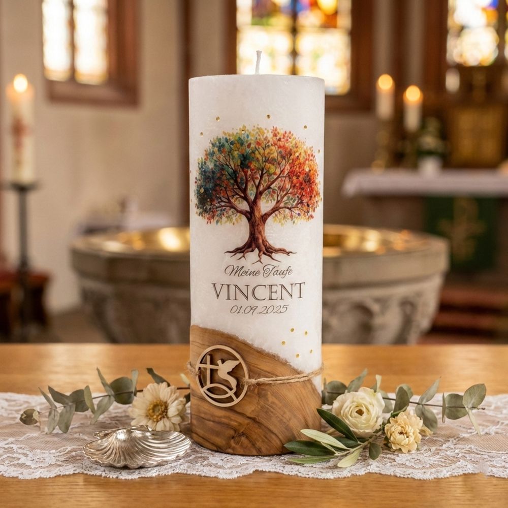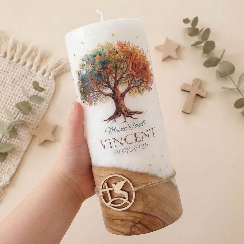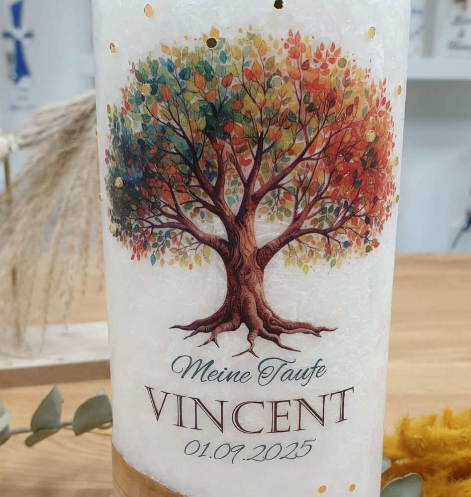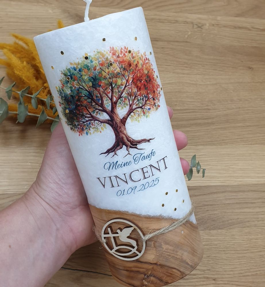 Taufkerze mit Holz und Designdruck mit Wachsverzierung und Holzanhänger aus unserer Kreativwerkstatt - Lebensbaum!