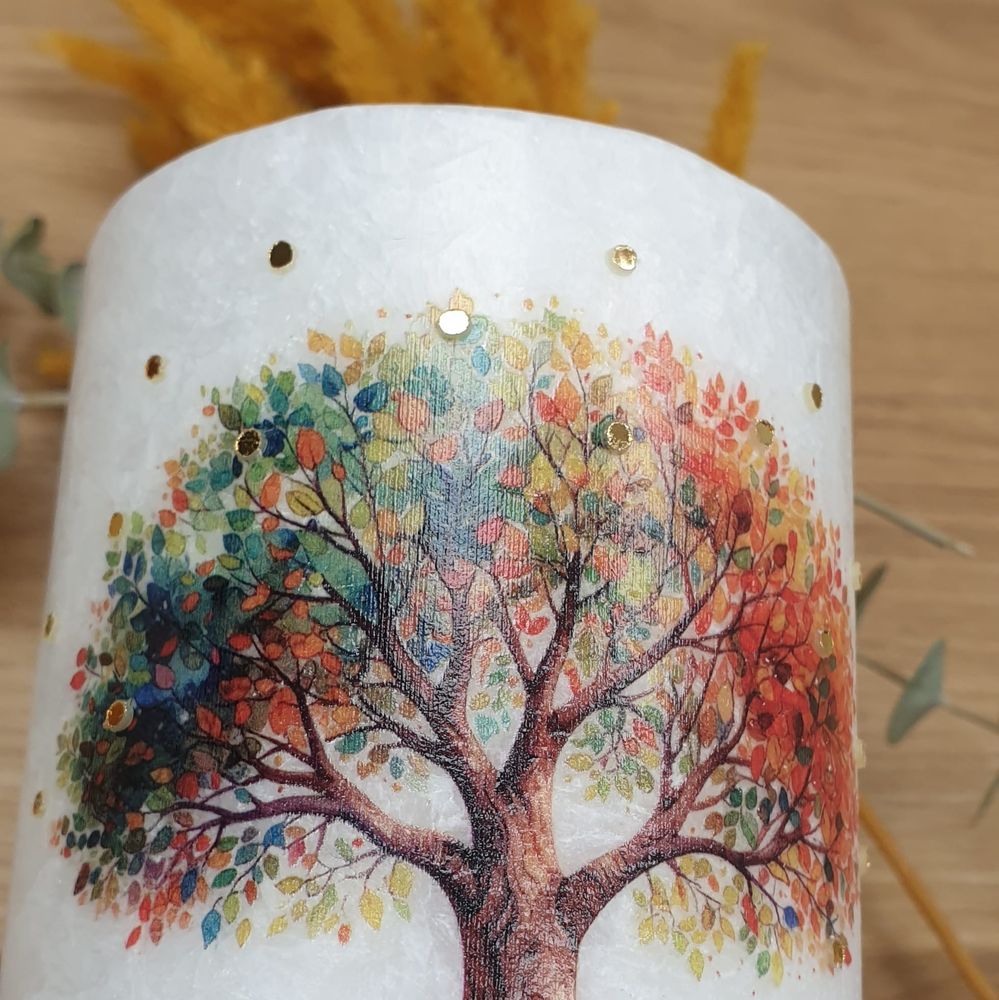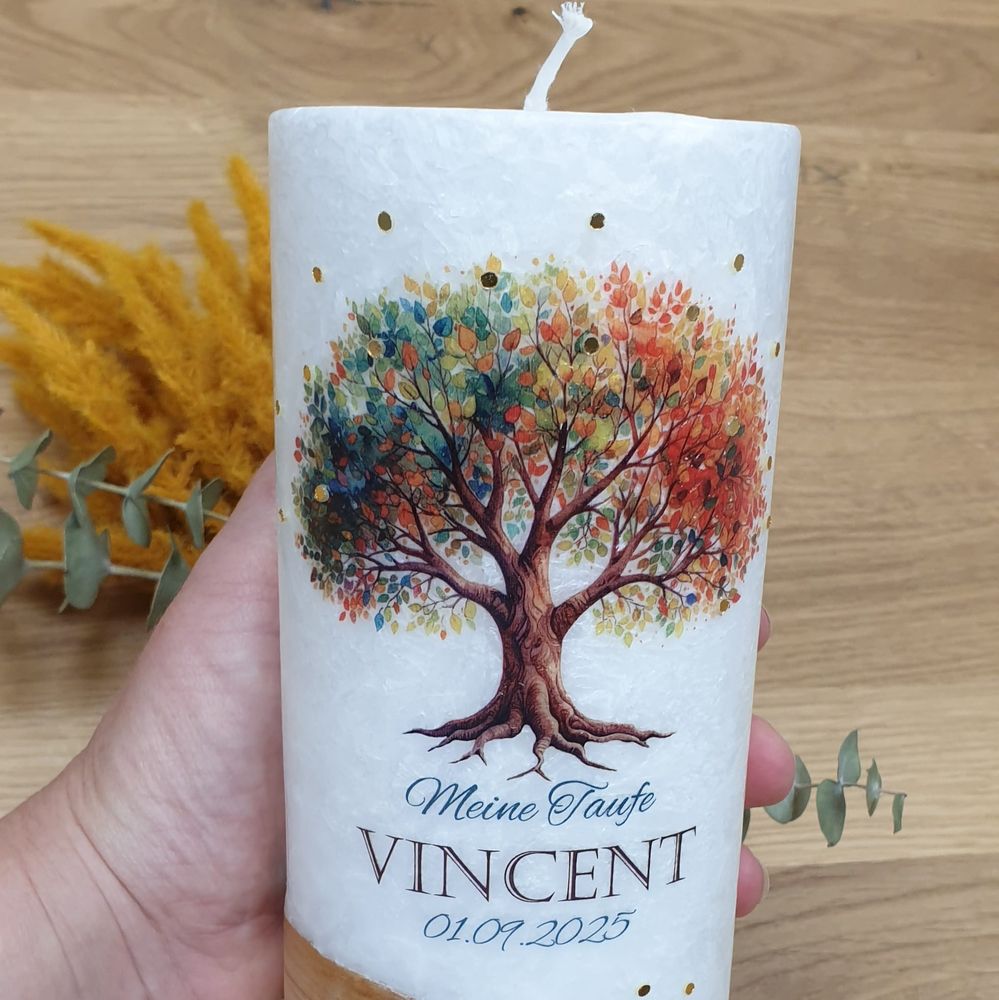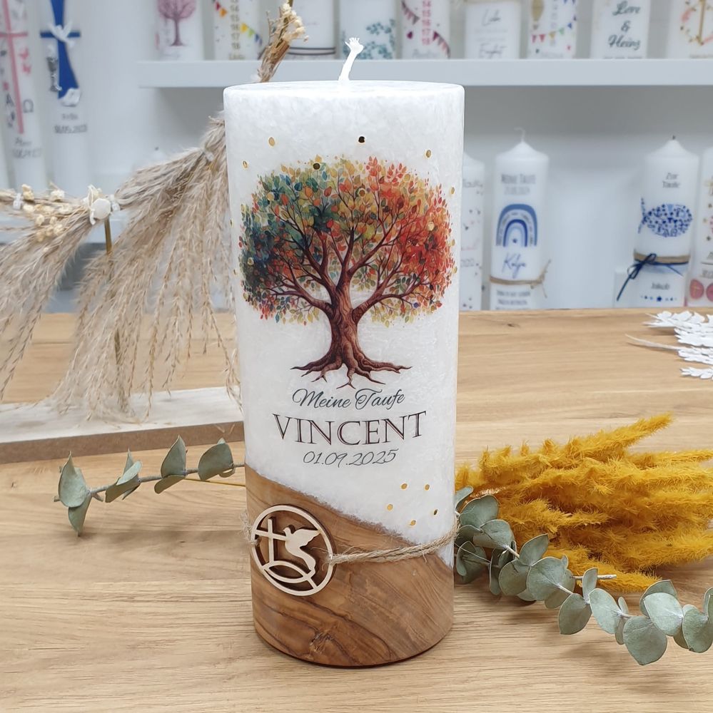 Taufkerze mit Holz und Designdruck mit Wachsverzierung und Holzanhänger aus unserer Kreativwerkstatt - Lebensbaum!