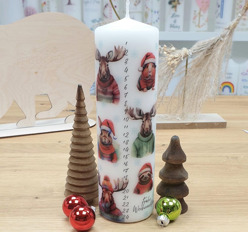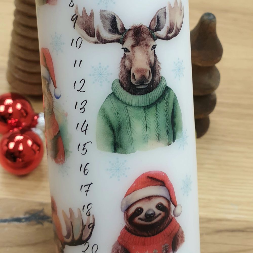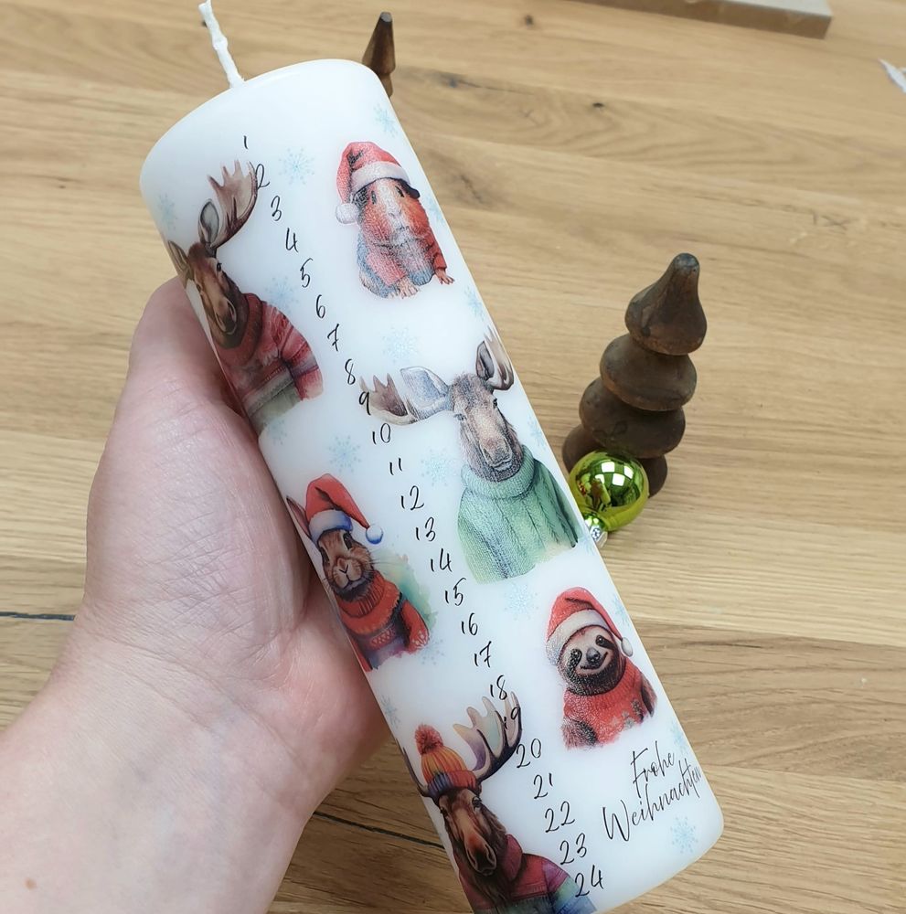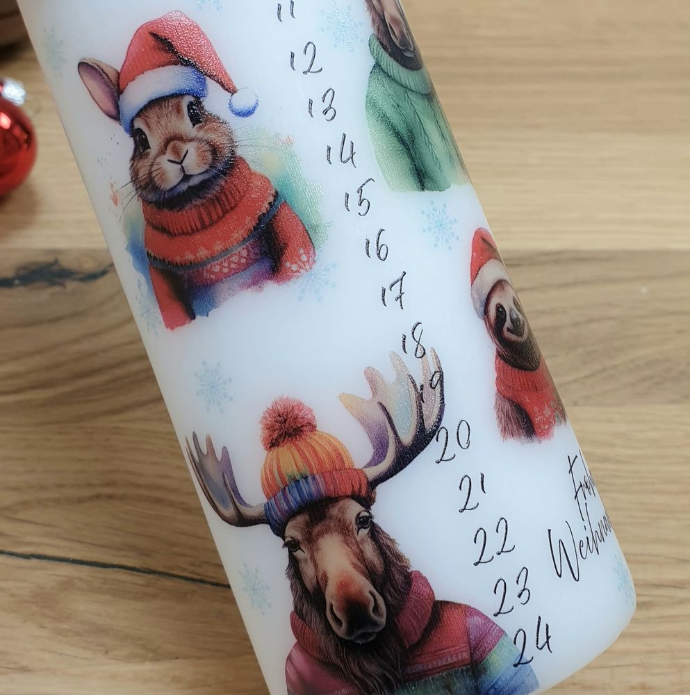 Weihnachtskerze mit Designdruck, als Adventskalender mit den Zahlen 1-24 und niedlichen Tieren bedruckt.